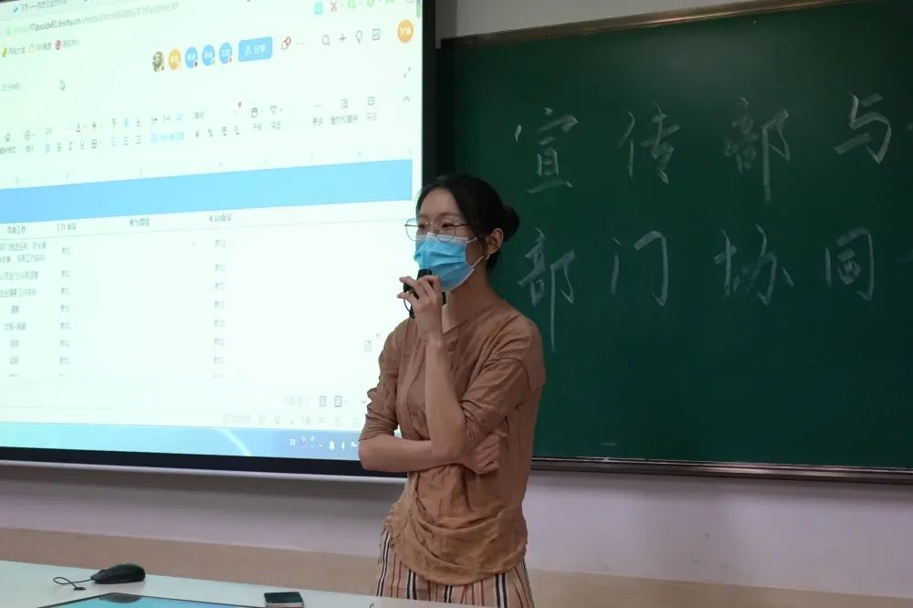 两个部门成员分别完成自我介绍,详细说明各自主要负责的工作;而后双方负责人分享各自部门的工作模式与工作注意事项。系融媒体中心负责人王佳雨主要介绍了其工作模式,公众号以推送会议,讲座为主,也会发布一些大型考试的注意事项等;系宣传部负责人张梦雅介绍到,公众号会以推送活动预告、活动结束反馈、考勤为主,除此之外还有节日海报等。