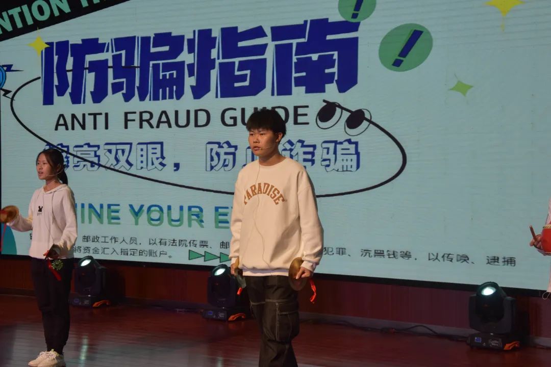 初次独立面对外面的世界,我们很有可能会遇到无形的骗局,为了提高大家的警惕性和防范意识,四位同学通过“三句半”和防诈骗版的《爱你》将“防诈骗”的观念渗透到大家的脑海里。