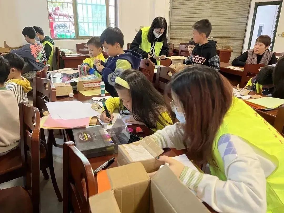 为增强小朋友们的绿色文明意识,积极践行习近平总书记“绿水青山就是金山银山”的发展理念。满天星志愿队以“旧物利用”为主题,在桥头陆村开展了废旧纸箱改造活动。