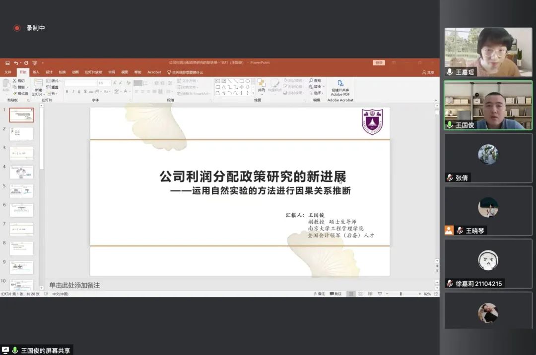 南京大学王国俊教授作了“公司利润分配政策研究的新进展——运用自然实验的方法进行因果关系推断”的主题分享。王教授从现代财务学的视角,引出其研究利润分配政策的理论研究基础,并结合利润分配政策中的实证因果推断效率不高等问题,寻找更加科学的研究方法,比如准自然实验方法等。同时王教授结合其已发表的核心期刊中对股息承诺相关研究、红利税制度背景、股份回购相关研究进行分享,并对我国股份回购相关研究的新政进行解读。最后针对范理老师如何寻找研究兴趣并确立研究方向给出建议和指导。