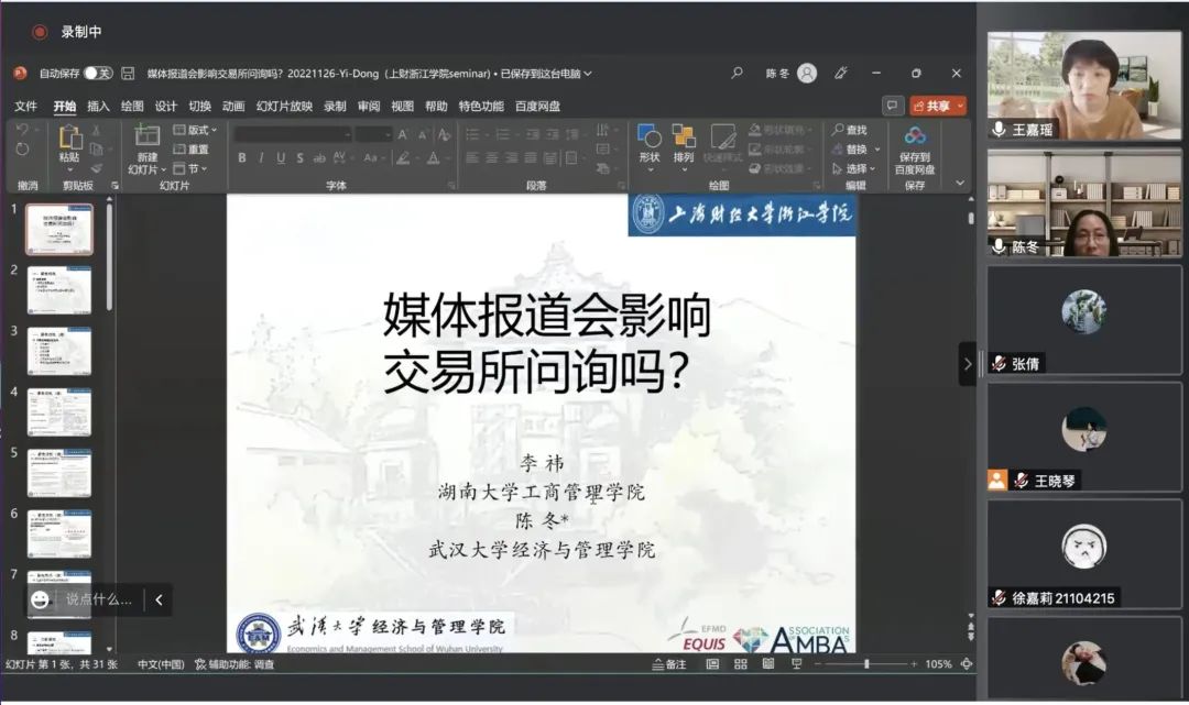 武汉大学陈冬教授作了“媒体报道影响交易所问询吗?”的主题分享。陈教授介绍了中、美在交易问询方面的差异并结合长园集团、商赢环球等案例引出研究动机,对相关文献进行综述的基础上提出研究假设、进行研究设计并对实证研究结果进行分析和稳健性检验,最终得出媒体报道与交易所年报问询概率的相关结论。最后陈教授与徐锐、范理老师就如何从案例、现象中提炼研究问题进行了交流。