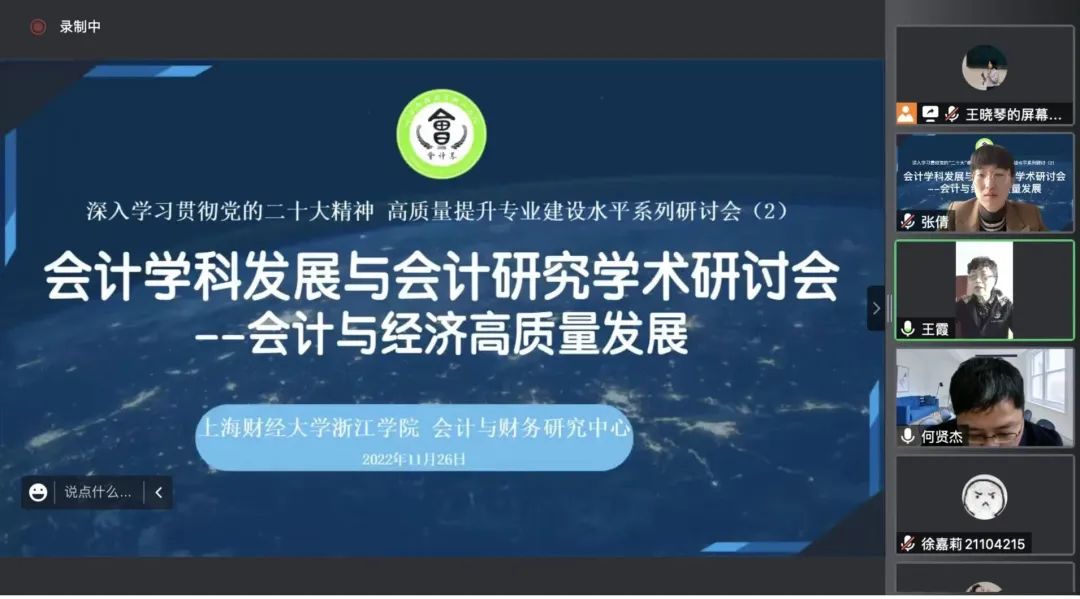 11月26日上午,为深入学习贯彻党的二十大精神,高质量提升专业建设水平,学院会计与财务研究中心成功举办“会计学科发展与会计研究学术研讨会——会计与经济高质量发展”。本次研讨会由上海财经大学会计与财务研究院指导,会计系会计与财务研究中心、《会计与经济研究》以及《财经研究》期刊社主办,邀请来自上海外国语大学、中南财经政法大学、武汉大学、南京大学多位专家学者开展主题研讨交流,共百余名师生参与了本次线上会议。、