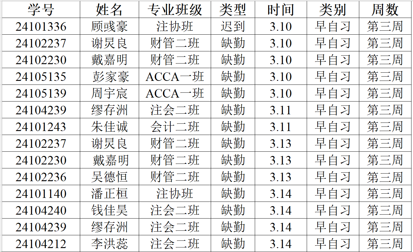 为营造良好的学习氛围,激发同学们的学习热情,倡导会计学子自觉遵守早晚自习相关规定,持续推动我院学风高质量建设,系部组织人员对学生早晚自习情况进行检查,现将检查结果公示如下: