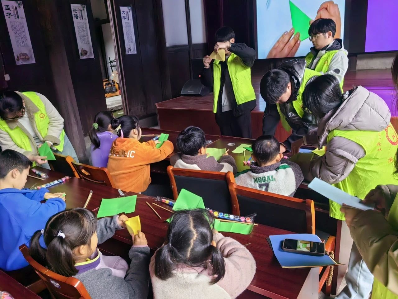 随后迎来高潮环节——手工制作雷锋帽,志愿者与孩子们分组合作,并对其进行指导。取绿色方纸对角轻折,巧手翻飞间纸张渐显轮廓。当红星徽章端正贴于帽檐时,孩子们雀跃试戴,自豪展示自己的劳动成果,清脆笑声充满了整个课堂。