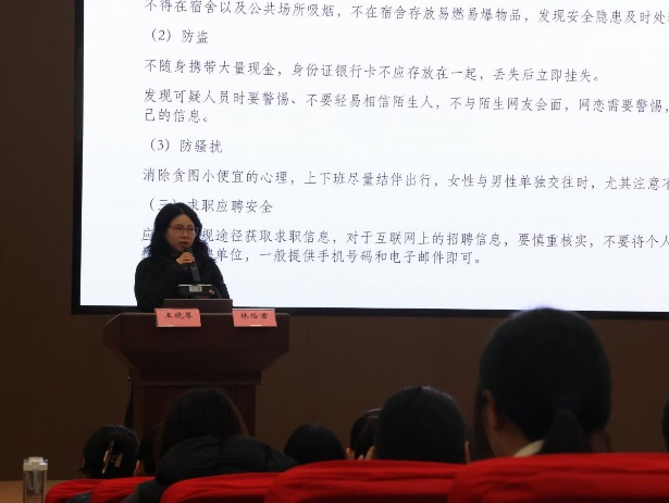 林怡君老师首先强调了实习与求职期间的安全问题,包括住宿安全、生活安全(防火、防盗、防骚扰)以及求职应聘安全。提醒同学们通过正规渠道获取招聘信息,保护个人隐私,警惕网络诈骗,确保求职过程安全可靠。