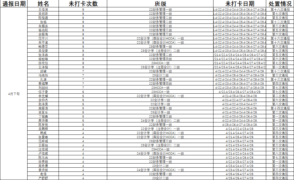 截止4月29日,结合今日校园晚归打卡记录,现将相关情况通报如下: