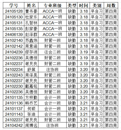 为营造良好的学习氛围,激发同学们的学习热情,倡导会计学子自觉遵守早晚自习相关规定,持续推动我院学风高质量建设,系部组织人员对学生早晚自习情况进行检查,现将检查结果公示如下: