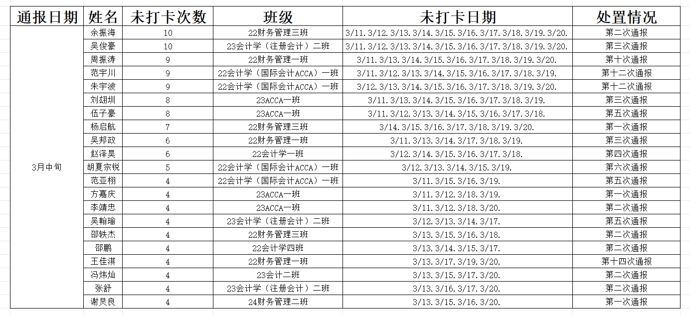 截止3月20日,结合今日校园晚归打卡记录,现将相关情况通报如下: