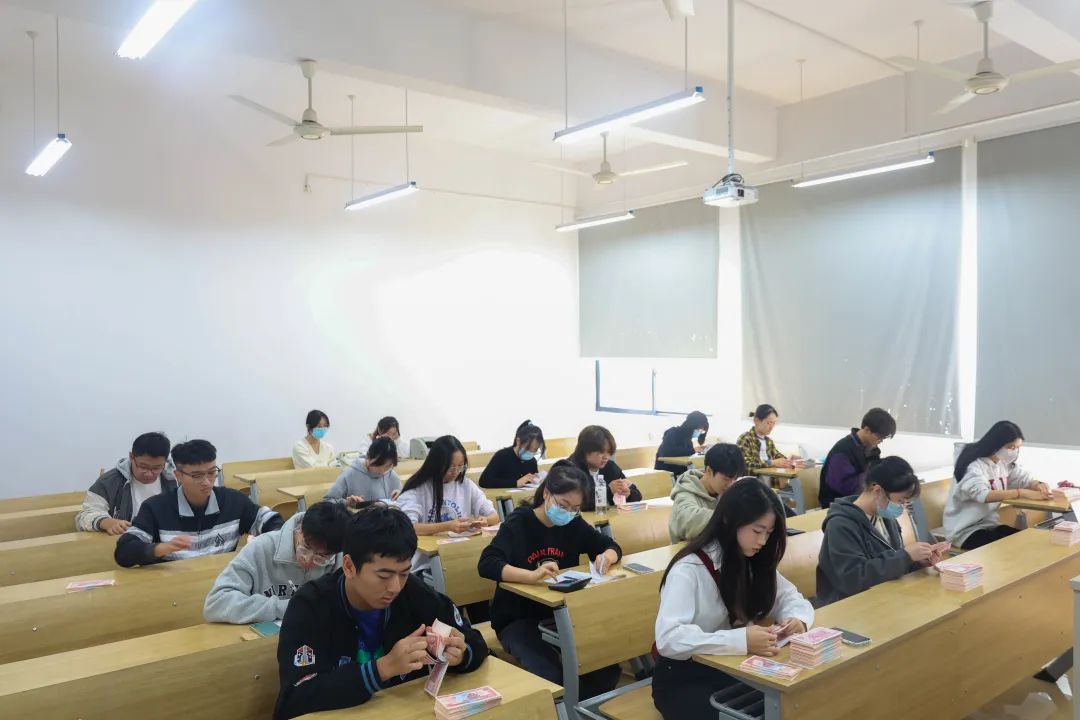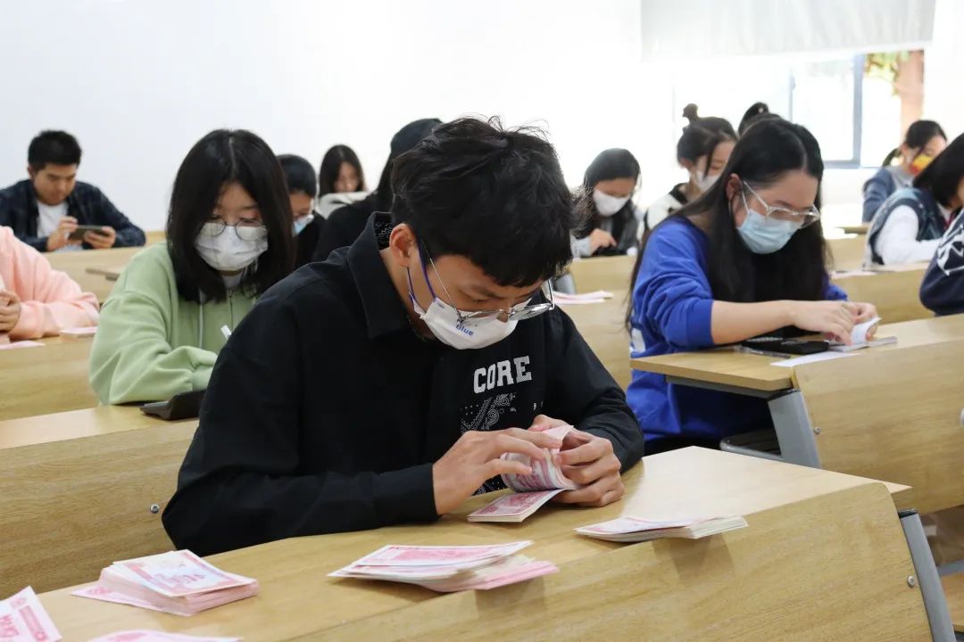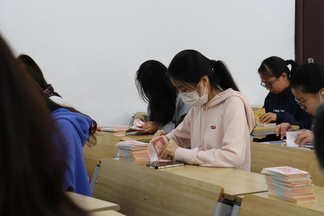 此次比赛共有60组队伍参与,大家都热情高涨,凝心聚力地完成了本次比赛。初赛共分为两个环节:点钞3分钟和翻打钞票5分钟,四人为一组,两个环节同时进行。