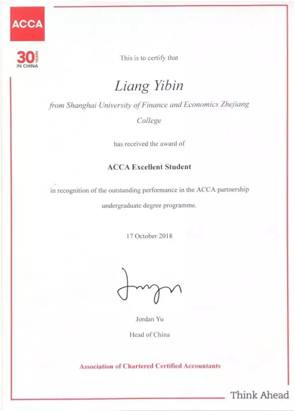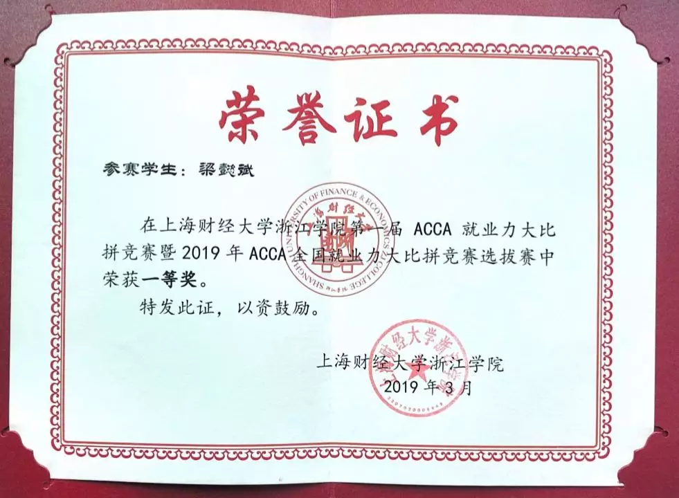 曾获得ACCA官方授予2017年度“Excellent student”荣誉