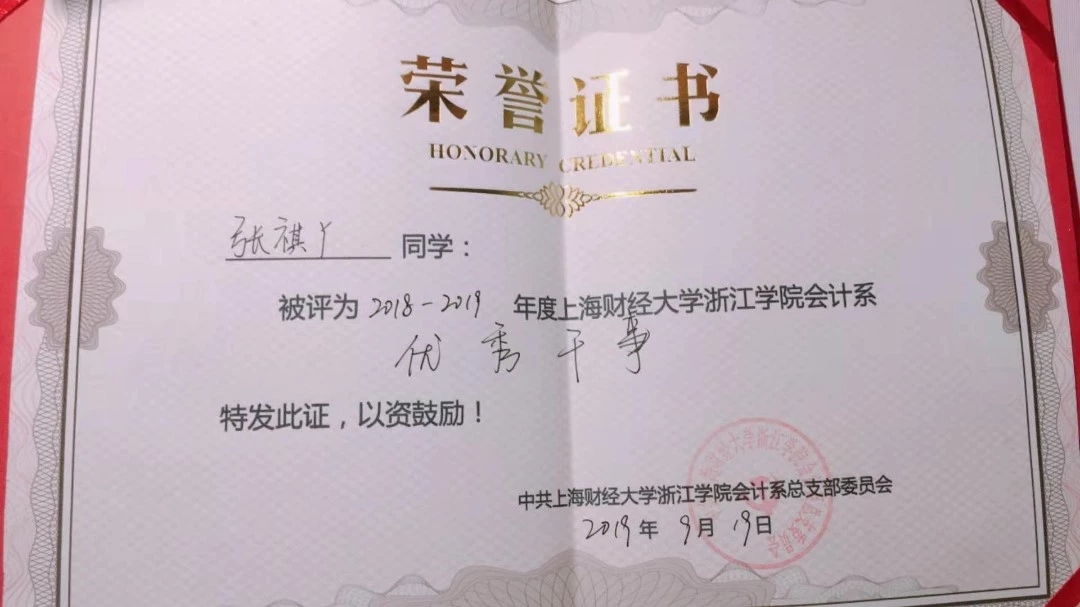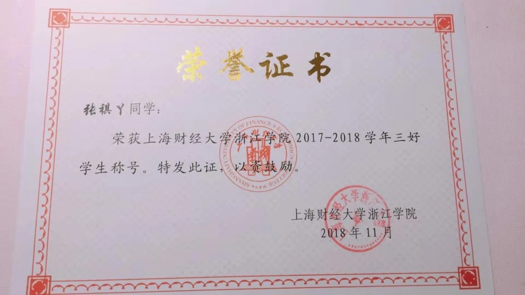 曾获得浙江省政府奖学金、学习优秀一等奖学金、校财会信息化大赛二等奖等