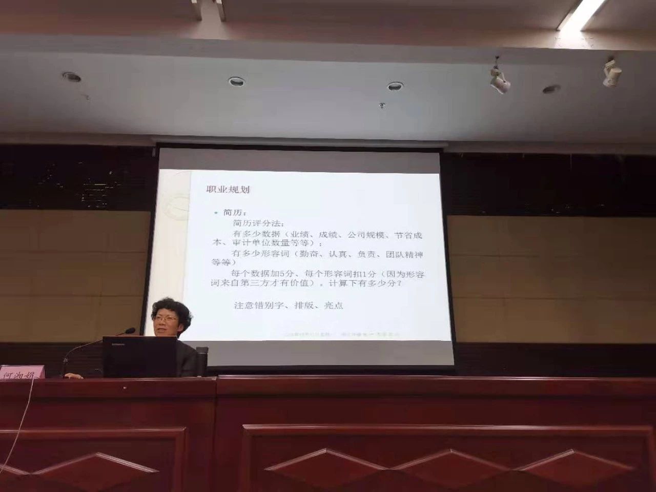讲座中,何湘娟所长通过讲述自身的职业生涯,让我们了解到了一一个专业会计从业人员的成长过程。何所长向我们列举了会计从业人员可以选择的工作岗位,强调了每个人对自身规划的重要性。并向我们指出了会计从业人员应该所具备的技能-专业素养、汇报能力、沟通技巧,强调了会计从业人员学习能力与工作经验的重要性,建议我们可以通过实践来增强自己的能力丰富自己的工作经验。