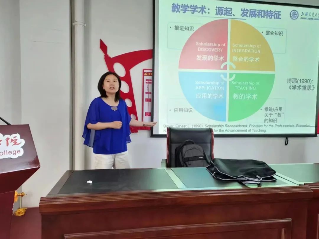 岑老师从自身的学习经历与教学工作实践出发,从理论和实践两方面回答了“‘教学学术’是什么”以及“‘教学学术’怎么做”两个问题。从“教学学术”的源起与发展开始,介绍概念、特征、一般步骤与实践应用等方面。针对目前高校教师既肩负着教书育人的教育责任,又承担了科学研究的学术要求这一现状,岑老师认为,可从教育学中“教学学术”这一领域出发,即将教学活动本身作为理论研究的对象,首先发现并提出问题,其次对所提出的问题进行评估与审查并将其进一步理论化,并缩小至学术研究的可行范畴内,然后确定研究思路与手段,最终形成研究成果。此外,岑老师还介绍了现行的主流教学学术类论文的基本架构,鼓励与会教师能更多地参与相关的学术研究。