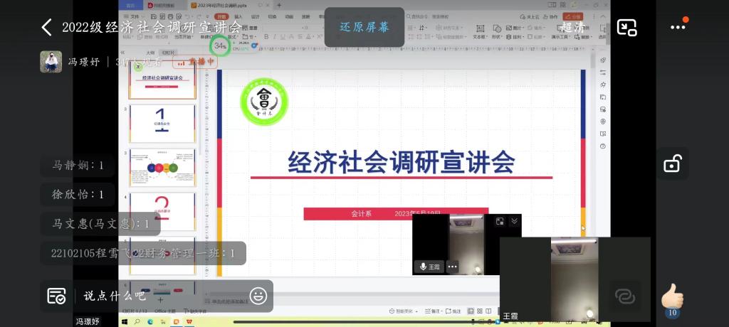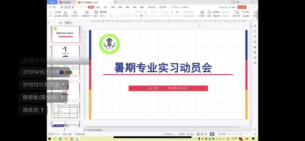 5月19日晚上,会计系在钉钉群召开2022级经济社会调研和2021级暑期专业实习线上动员大会。会计系负责人王霞老师、教学秘书冯璟妤老师参与本次会议。