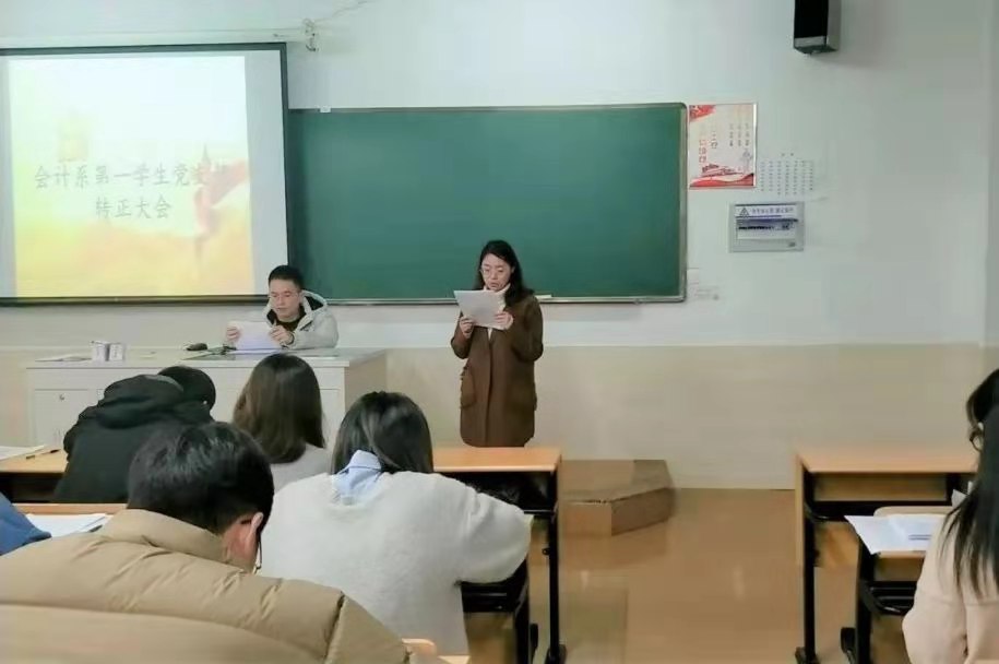 2019年12月25日晚,会计系第一、第二学生党支部召开党员发展与转正大会。大会在教学楼7幢110、7幢112召开,张凯旋同志和林轩豪同志担任主持,第一学生党支部书记王文红老师列席了会议。