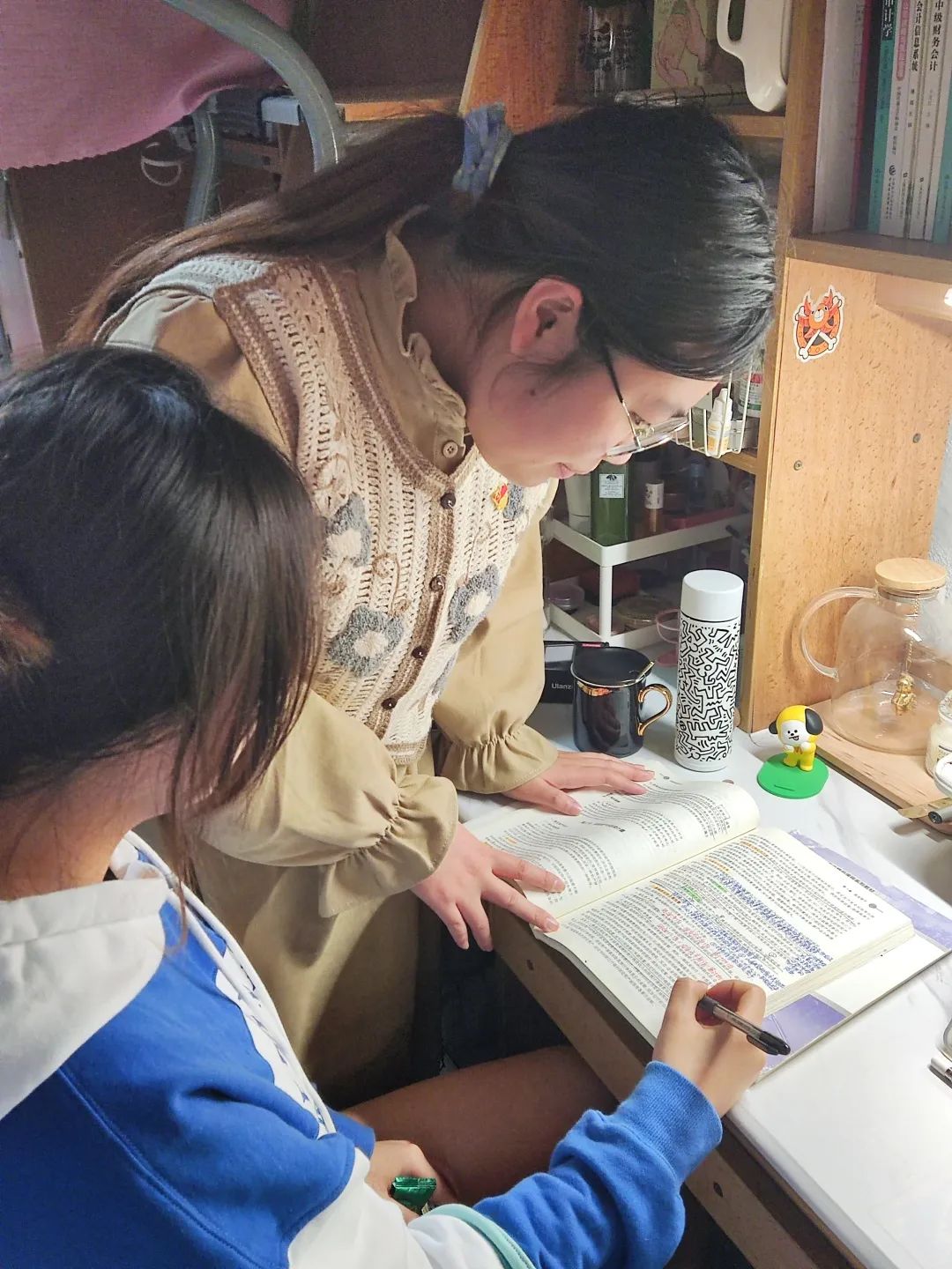 由于疫情原因,本次帮扶没有进行集中辅导,但是会计系学生党员们仍然尽职尽责,即使夜幕降临也一直悉心地帮助同学们解决问题并乐于传授经验。