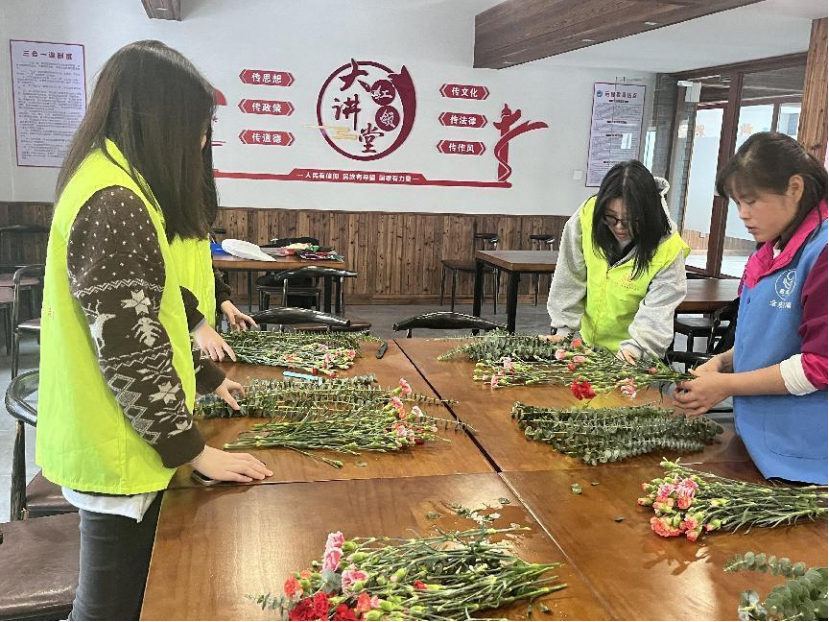 活动开始前,志愿队来到澧浦镇党群服务中心,提前做好康乃馨、包装纸等的分类和制作学习工作,使老人们有更好的活动体验。随着老人们陆续来到现场,志愿者们与她们热情问候与交流,让老人们能很快融入花束制作的氛围。