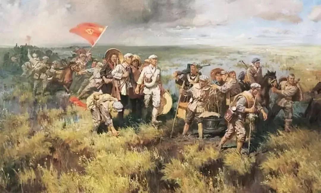 1934年,江西中央苏区第五次反“围剿”失败。为保存实力,中央红军被迫进行战略转移。经过艰苦的战斗,红军突破了国民党军队的三道防线,兵临湘江。敌人利用天险加重兵力,设下第四道防线,红军处境险恶。毛泽东在没有兵权、没有领导地位的情况下,分析了当前形势,提出避实就虚,甩掉敌人主力,到敌力量薄弱的贵州去。1935年1月中共中央在贵州遵义召开了政治局扩大会议,结束了党内“左”倾冒险主义的错误路线,确立了毛泽东、朱德、周恩来为领导核心。从此在毛泽东的正确判断和指挥下,红军四渡赤水,声东击西,运动敌人,顺利通过彝族地区,向北挺进。长征路上,红军强渡大渡河、爬雪山、过草地,克服了难以想象的困难。经过两万五千里的长途跋涉,1936年10月10日红军三大主力终于在陕北山城堡胜利会师。毛泽东伏案疾书:红军不怕远征难,万水千山只等闲。