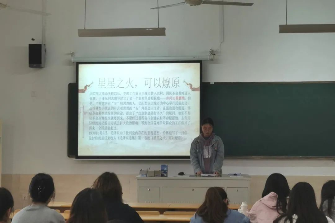 接着,陈佳维同志介绍井冈山精神,她以八七会议、秋收起义和三湾改编为切入点,向学生党员讲述了井冈山革命根据地的建立。