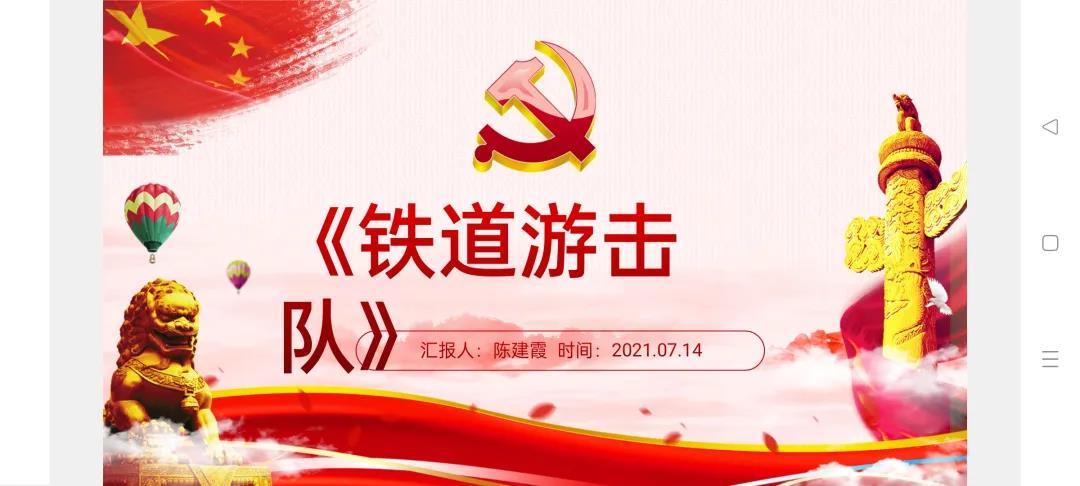 陈建霞同志分享《铁道游击队》一书,该书介绍的是在抗日战争时期,鲁南地区在中国共产党领导下的一支游击队在临枣支线、津浦干线上,打击日伪军的交通线、与敌人进行游击斗争的英雄故事。故事生动曲折,人物栩栩如生,富有传奇性。它揭露了日本帝国主义侵略中国的滔天罪行,歌颂了铁路工人抗击日寇的顽强意志和英勇战斗精神。