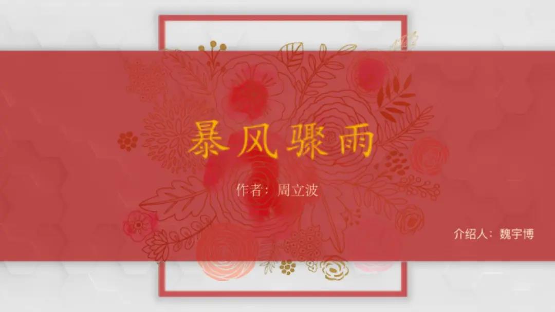 魏宇博同志分享的《暴风骤雨》是现代作家周立波所创作的一部长篇小说。小说以磅礴的革命气势、鲜明的阶级爱憎以及丰满的人物形象,再现了新民主主义革命时期中国农村暴风骤雨般的阶级斗争。