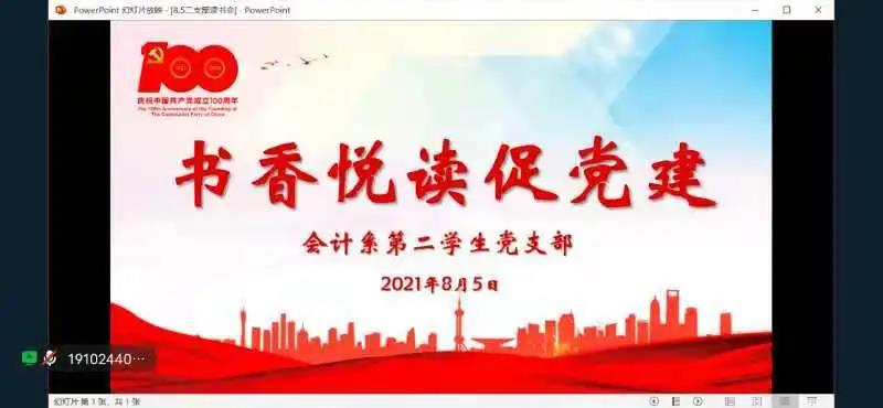 为营造优良的读书氛围,塑造更深的文化底蕴,会计系第二党支部于8月5日18时30分,在线上开展“书香悦读促党建”专题读书分享会,本次会议由卢雅斯同志主持。