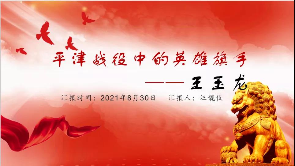 汪靓仪同志介绍了平津战役中的英雄旗手——王玉龙的故事。在1949年在解放天津的战役中,王玉龙迎着隆隆炮火握住只剩半截旗杆的红旗,将红旗牢牢地插在城头,为后续部队打开突破口,引导战友们向前移动,却在敌人的疯狂射击下壮烈牺牲。