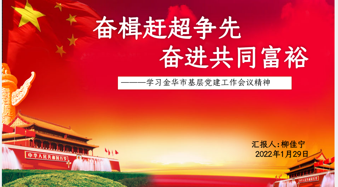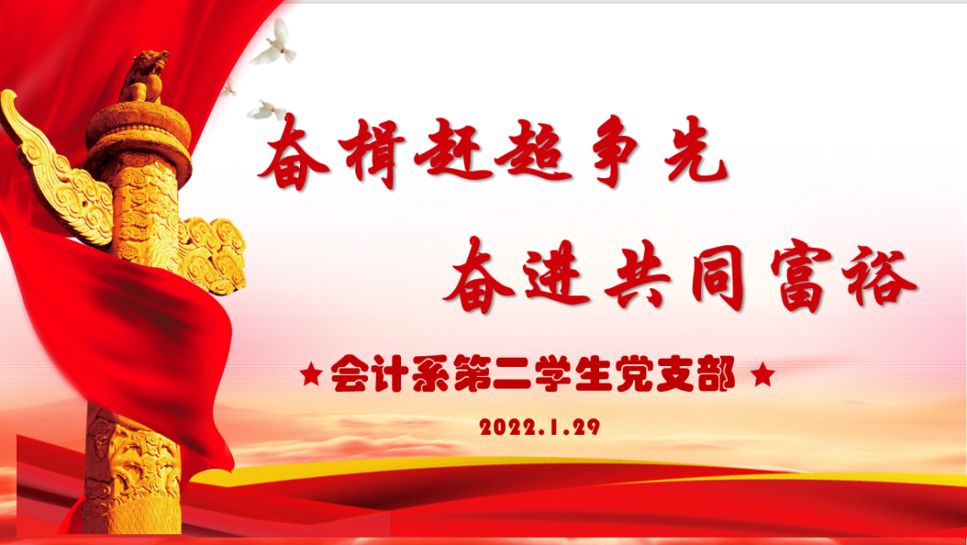 为深入学习金华市基层党建工作会议精神,领会重要会议精神,会计系第二学生党支部于2022年1月29日19时30分在线上钉钉群召开“奋楫赶超争先,奋进共同富裕”一月主题党日活动,本次会议由柳佳宁同志和余靖怡同志担任主讲。