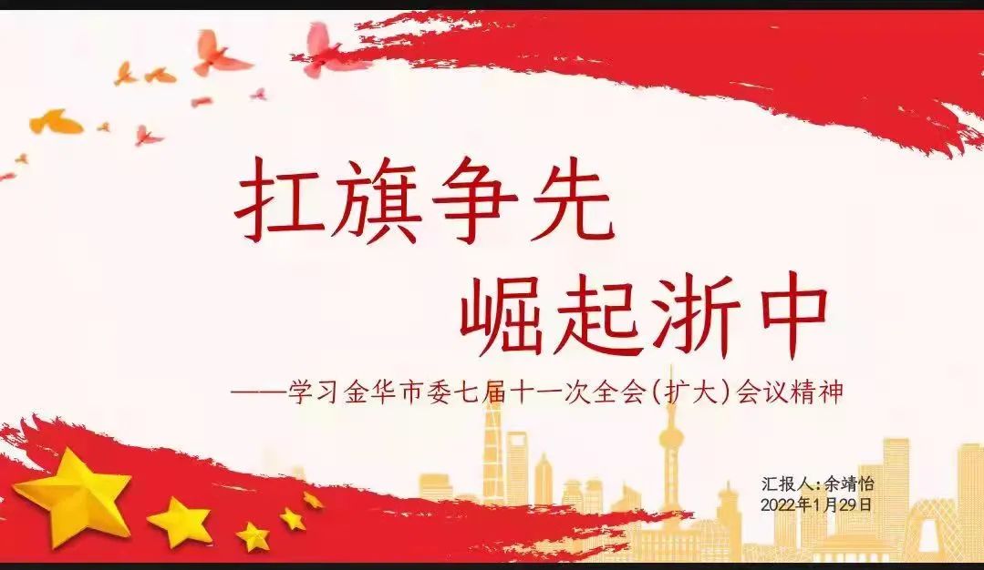 紧接着,余靖怡同志针对“学习金华市委七届十一次全体(扩大)会议精神”展开,共分为三个部分进行阐述:会议召开概况、会议主要内容、学习会议精神。