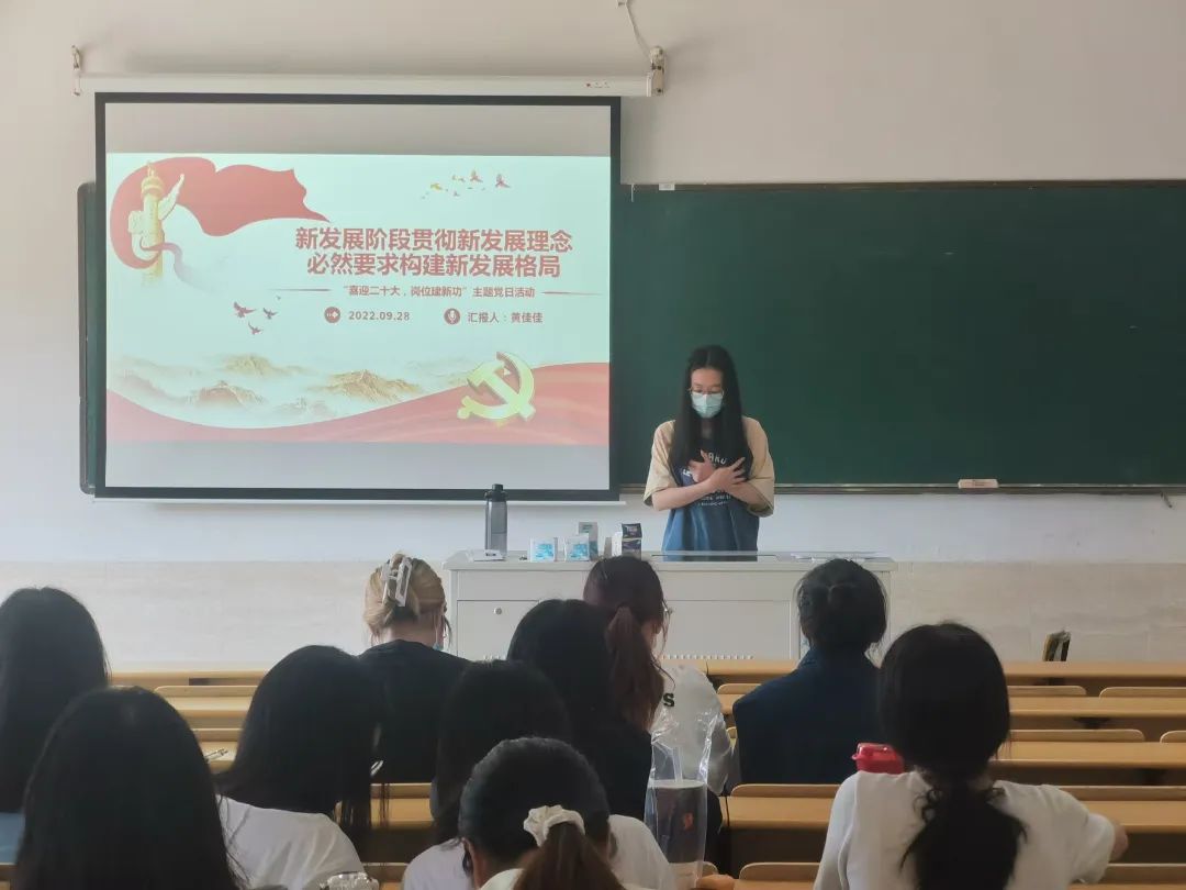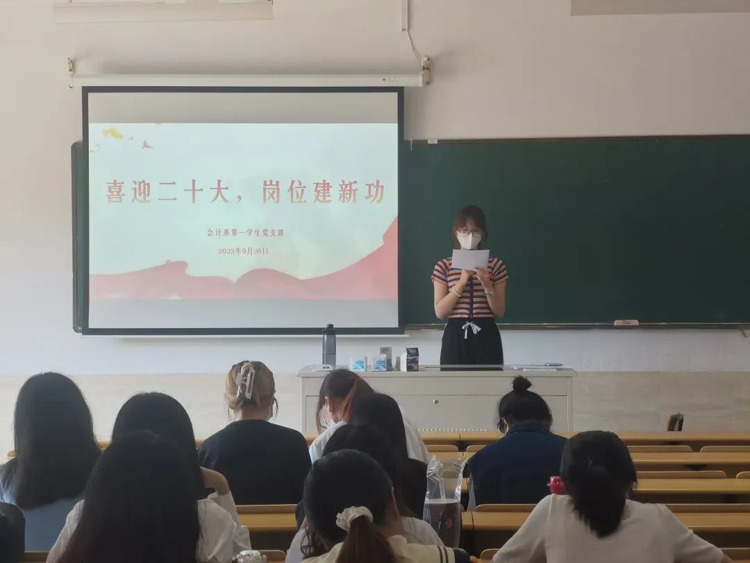 2022年9月28日中午12:30,会计系第一学生党支部召开以“喜迎党的二十大,岗位建新功”为主题的党日活动。此次活动由纪嘉琪同志主持开展。