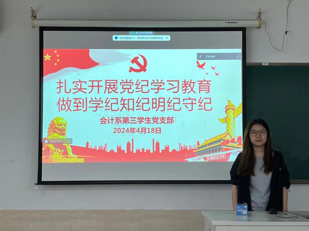 2024年4月18日12点30分,为进一步增强学生党员的纪律意识,会计系第三学生党支部在7-208开展“扎实开展党纪学习教育,做到学纪知纪明纪守纪”主题党日。本次主题党日前,会计系第三学生党支部书记黄松对本支部党纪学习教育作了动员部署。本次主题党日以“深入学习习近平新时代中国特色社会主义思想,认真谋划开展党纪学习教育,全面整治形式主义”为第一议题,徐静微同志主持,由高艺菲同志、庄艳茹同志、陈佳璐同志担任主讲。